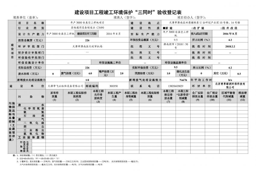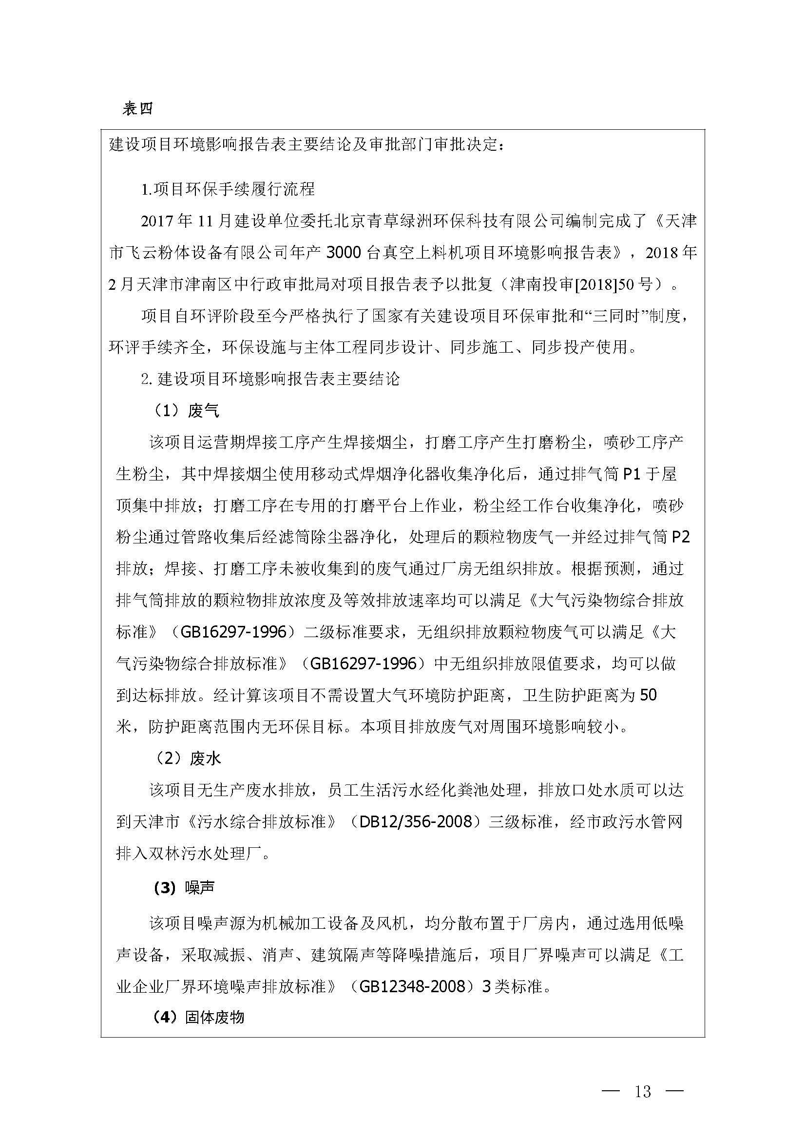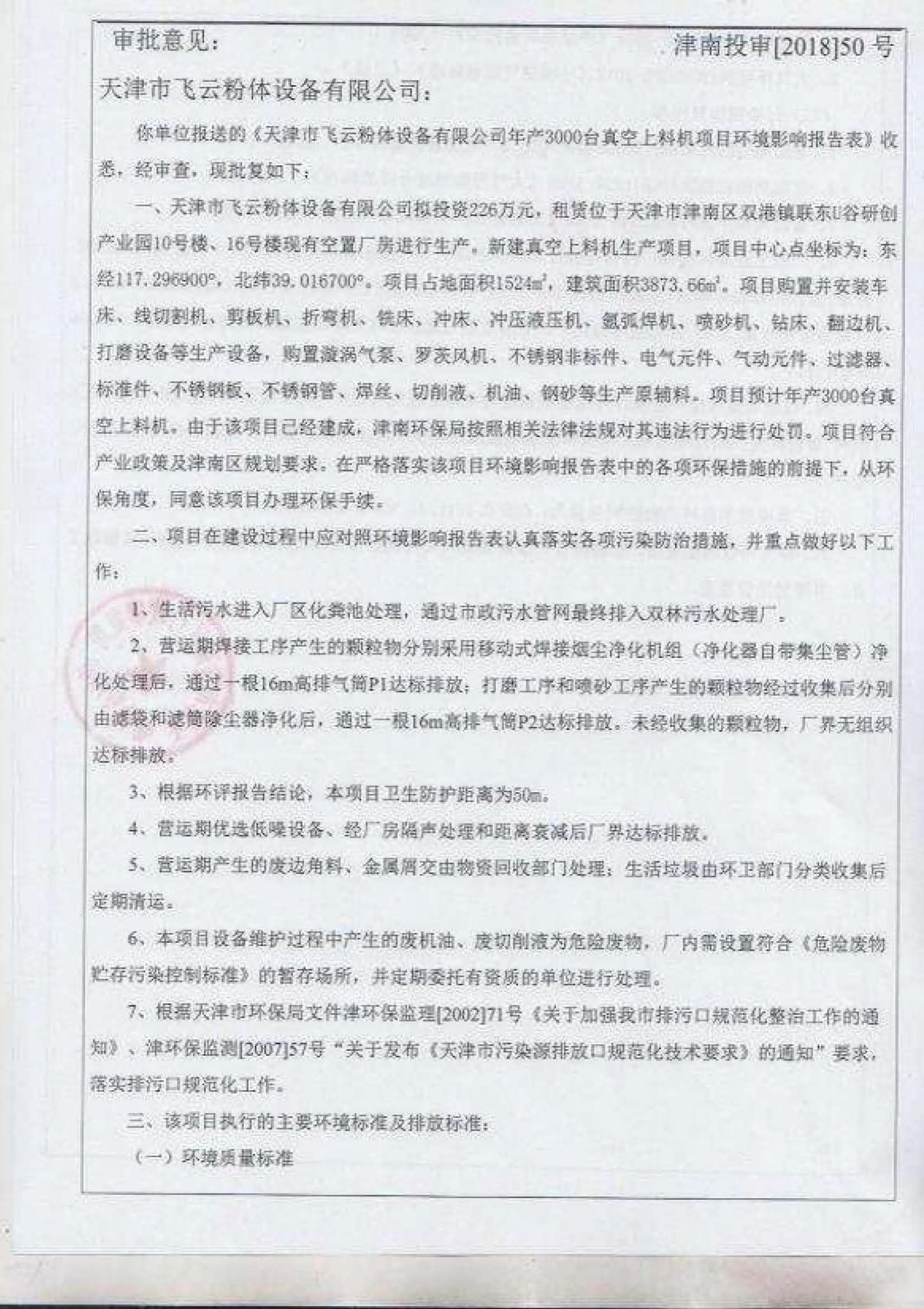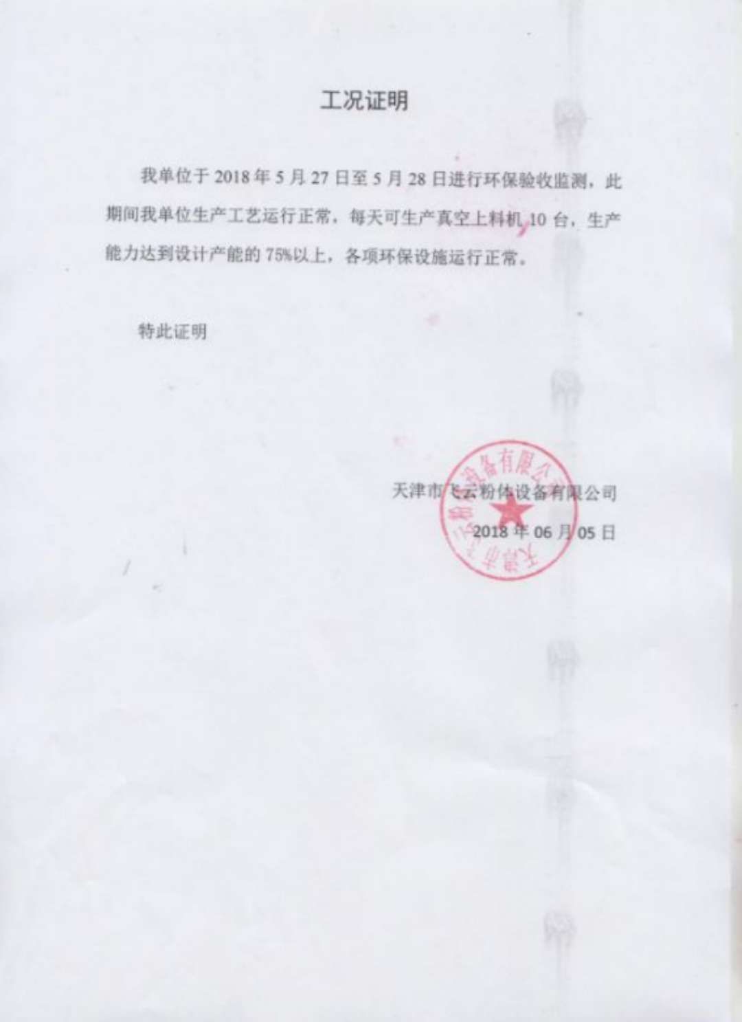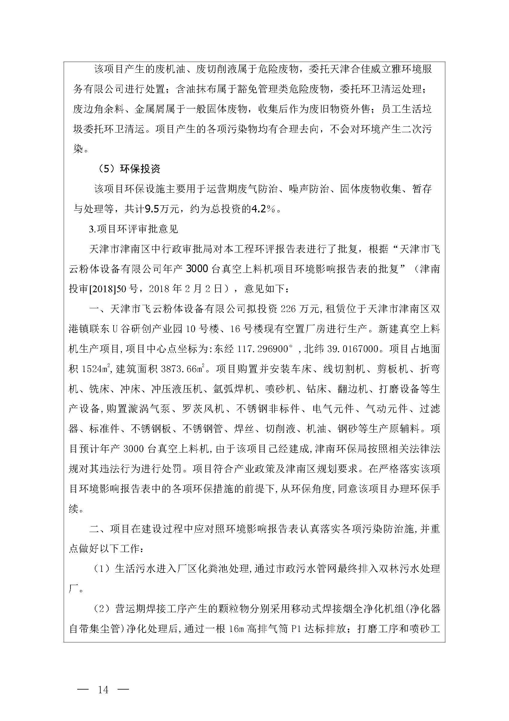 天津市飛云粉體設備有限公司年產 3000 臺真空上料機項目竣工環(huán)境保護 驗收監(jiān)測報告表