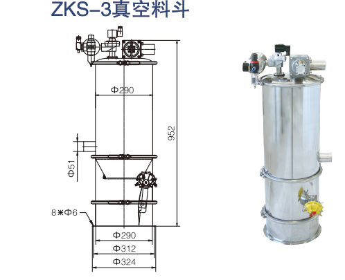 真空加料機(jī)由真空泵(無(wú)油、無(wú)水)、真空料斗、過(guò)濾器(有聚酯覆膜過(guò)濾器、PE過(guò)濾器、316L不銹鋼過(guò)濾器或鈦金屬過(guò)濾器多種選擇)、壓縮空氣反吹裝置、氣動(dòng)放料門裝置、料位自動(dòng)控制裝置、不銹鋼吸料咀、輸送軟管等組成,整套系統(tǒng)設(shè)計(jì)合理、制造精美。